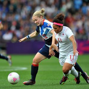 After such electrifying group stage performances, Hope Powell's team never got to grips with their quarter-final as Canada secured a deserved win and a trip to Old Trafford to meet the United States on Monday. Jonelle Filingo and Christine Sinclair got the first-half goals and, in truth, it could have been more.